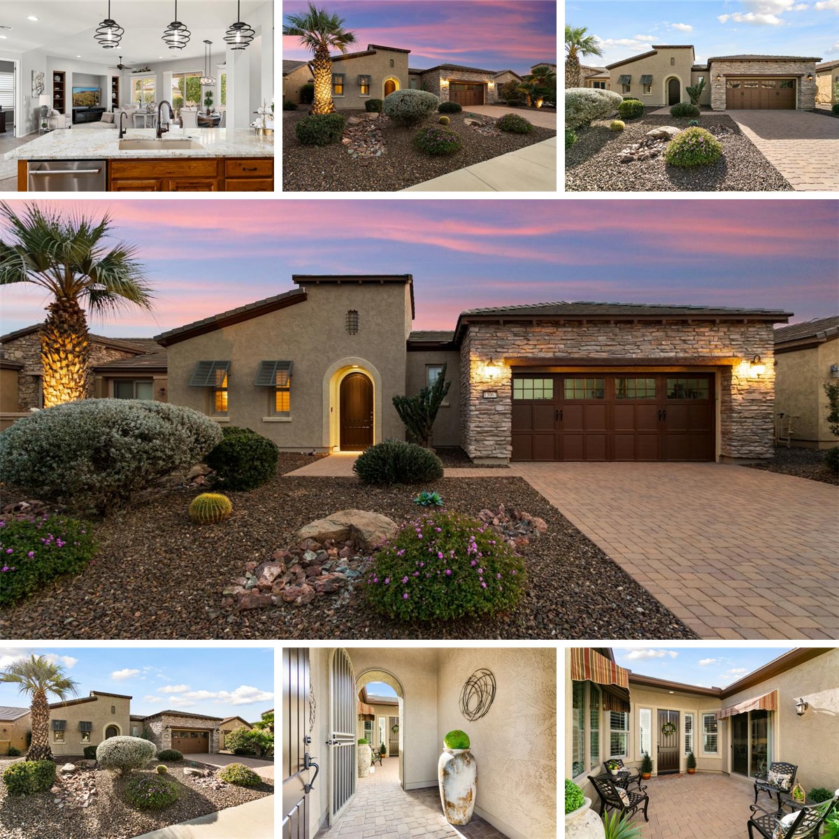 Experience elevated desert living in this HIGHLY UPGRADED model-like Civitas with designer finishes and two private outdoor living spaces! Striking curb appeal welcomes you with a Tuscan-inspired stone façade, paver driveway, and a courtyard enhanced by custom awnings and a beautiful new water feature—creating a tranquil space to enjoy your morning coffee. Inside 10-ft ceilings and neutral textured tile flooring set the tone for refined elegance throughout this open concept plan. The gourmet kitchen is a true showpiece, featuring stainless GE Café appliances with GAS range, granite countertops, BLANCO sink, custom subway tile backsplash, premium staggered cabinetry, roll-out shelving, and whisper-close hinges. This exceptional home features designer lighting and fixtures through out.